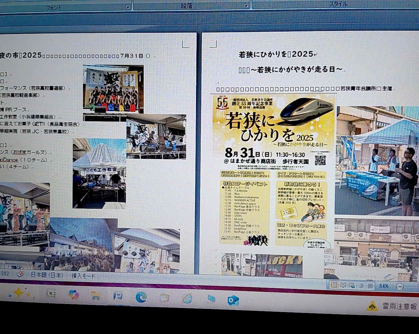 資料作成中 2025年10月14日 カテゴリ01 来週24日は、福井県商店街組合連合会が開催されます。 なので、当商店街のイベントなどの取り組みを資料としてまとめています。 県内にはもっと大きな組合員さんも多い商店街組合が有るのに、 長く理事をさせている関係上、大役がまわってきたのです。 ご多用の中、集まった皆様と意見交換する何か資料をと思いまして・・・