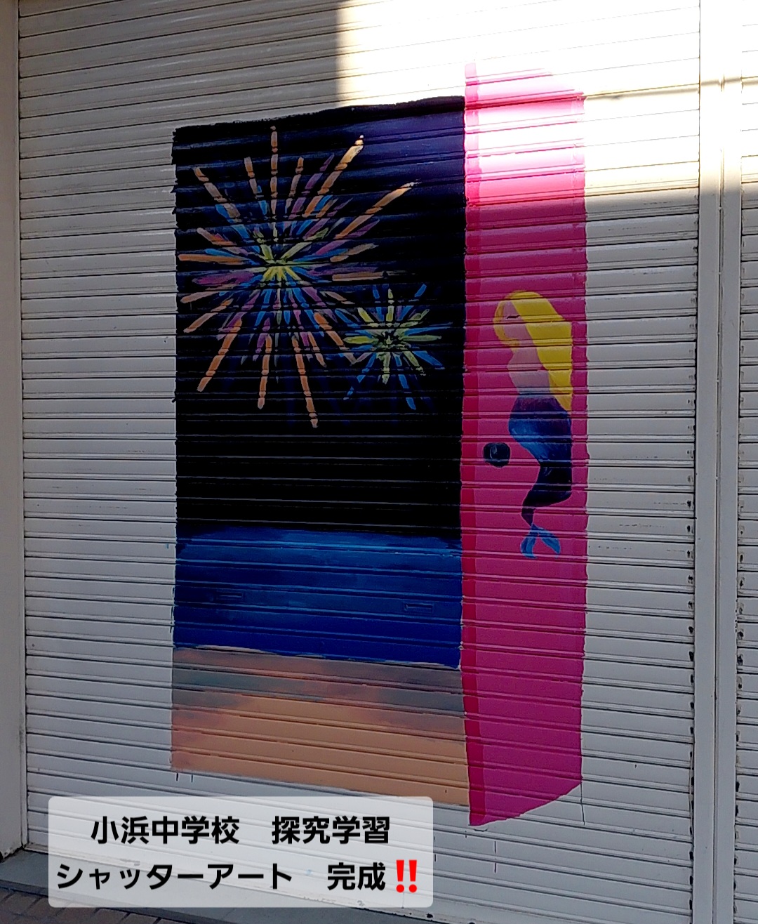 アート 完成!! 2025年12月22日 カテゴリ01 小浜中学校の生徒さんたちが探究学習で描いてくれていた 「シャッターアート」が完成しました。 当商店街の会館に1階シャッター(左側)です。 花火とマーメイドがモチーフになっています。 是非、ご覧下さいね!!